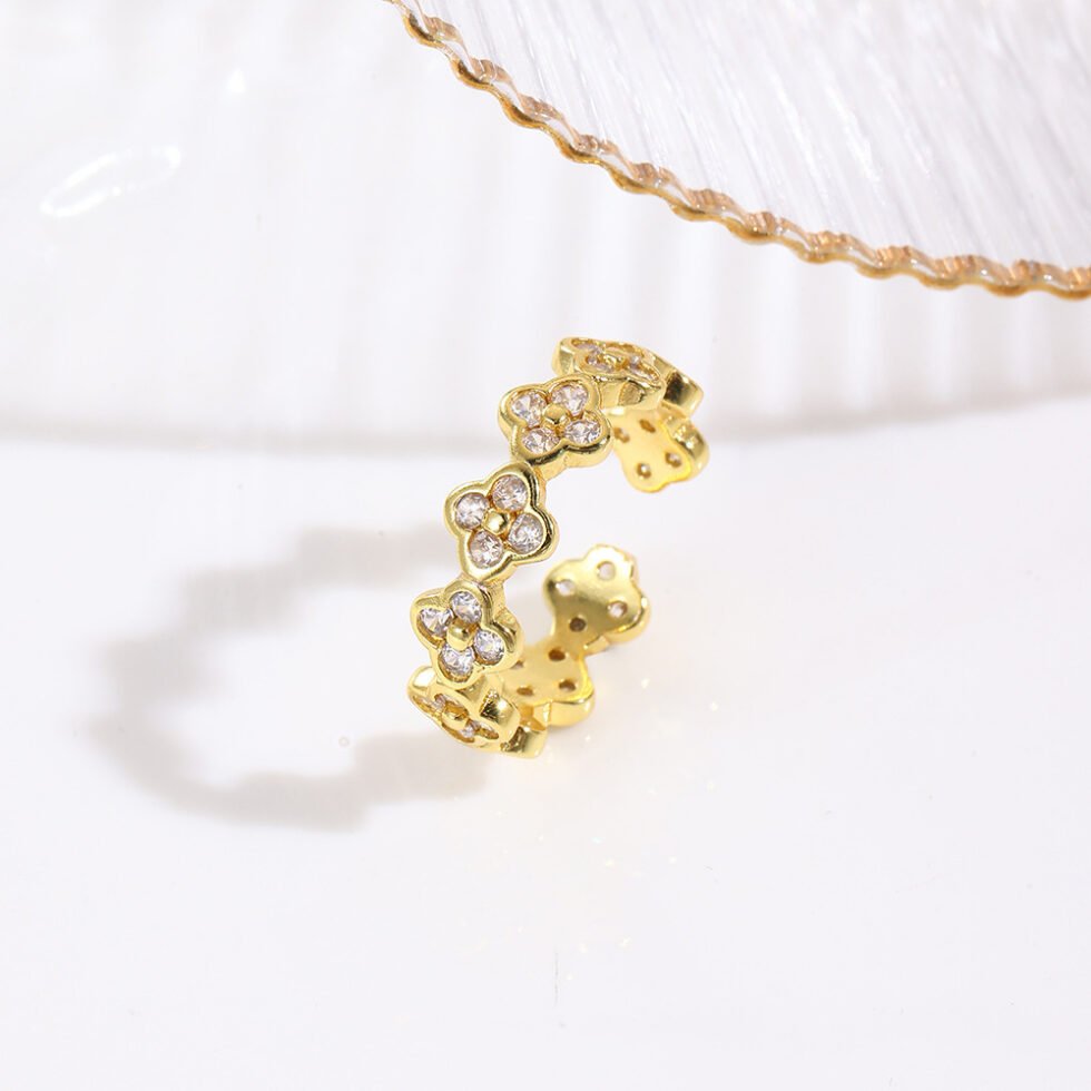 Inspired by fragments of rainbows and four-leaf clovers, this ring features four differently colored cubic zirconia stones set into its band—soft pink for love, bright lemon yellow for wealth, mint green for health, and misty purple for wisdom. The ring itself is crafted with a fine light-spray technique, giving it the delicate appearance of morning dew. Delicate 18K gold-brushed veins weave between the leaves, mimicking the natural growth patterns of a real clover.