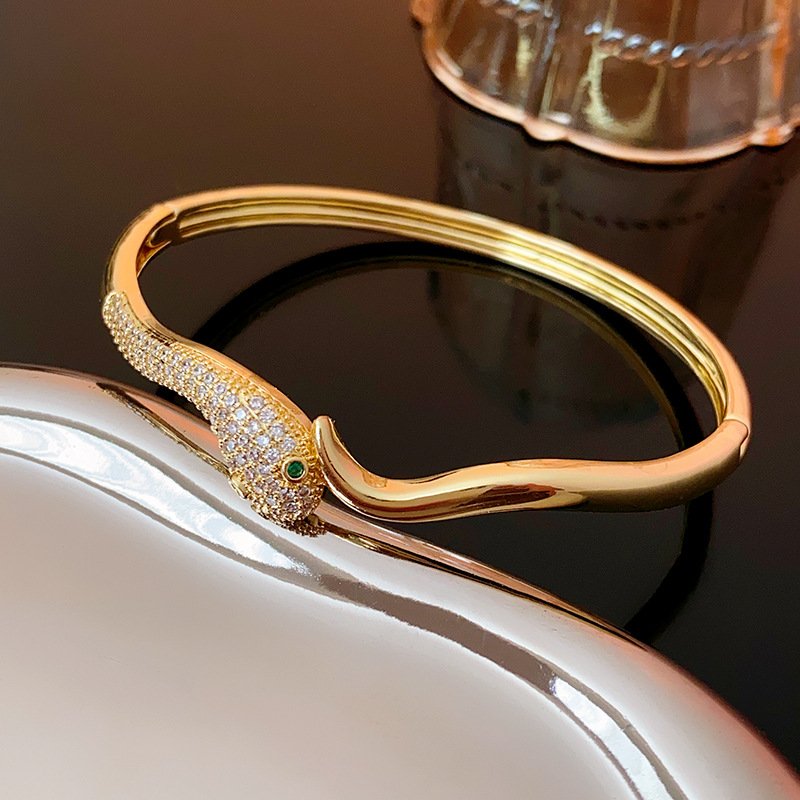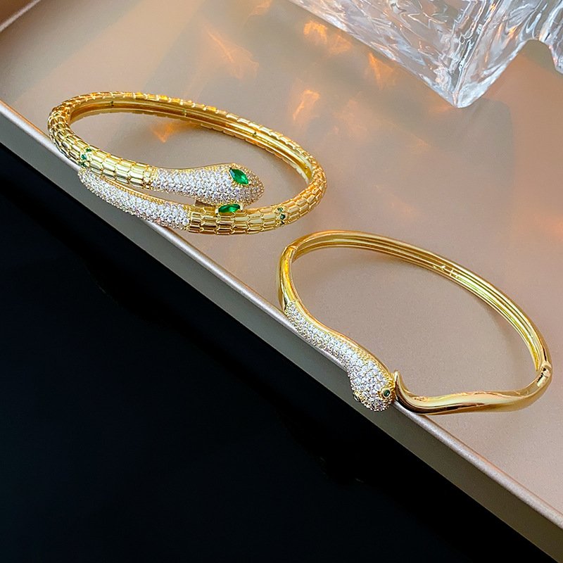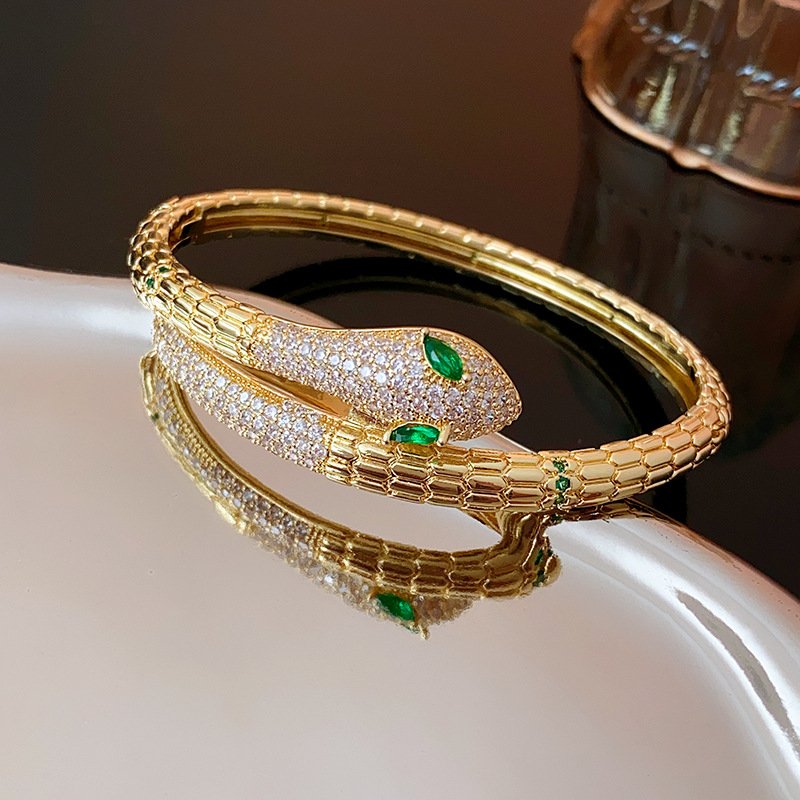 当蛇形图案与璀璨的锆石相遇,一件危险的艺术作品悄然觉醒。镀金蛇身以流畅的曲线缠绕于腕间,鳞片在光线下泛着精致的波纹,仿佛随时准备优雅地滑行。蛇头微微扬起,镶嵌着绿色锆石的双眼散发着深邃而神秘的光芒——这是来自丛林深处的神秘信号,是欲望与神性之间无声的碰撞。